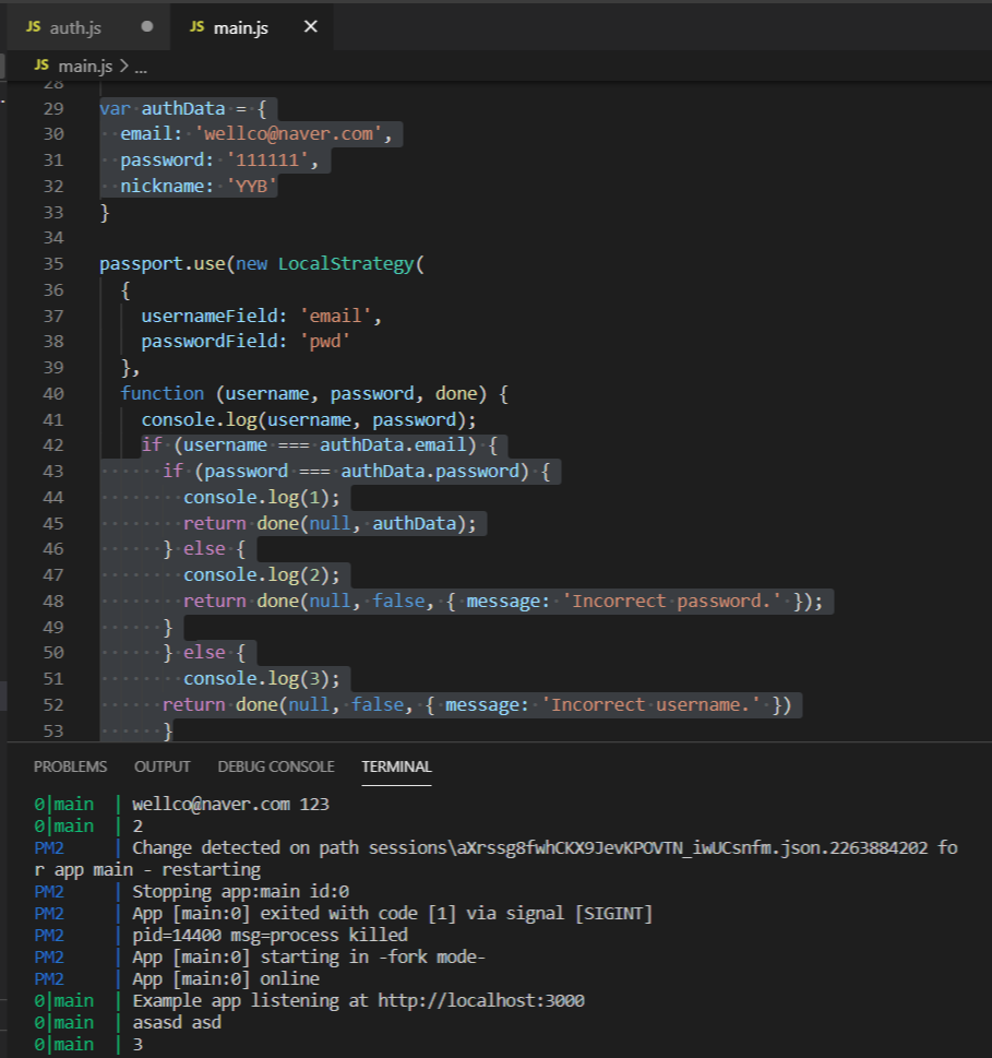 목표 : session으로 구현한 인증을 passport(user&pwd로그인 전략)로 재구현 해보자