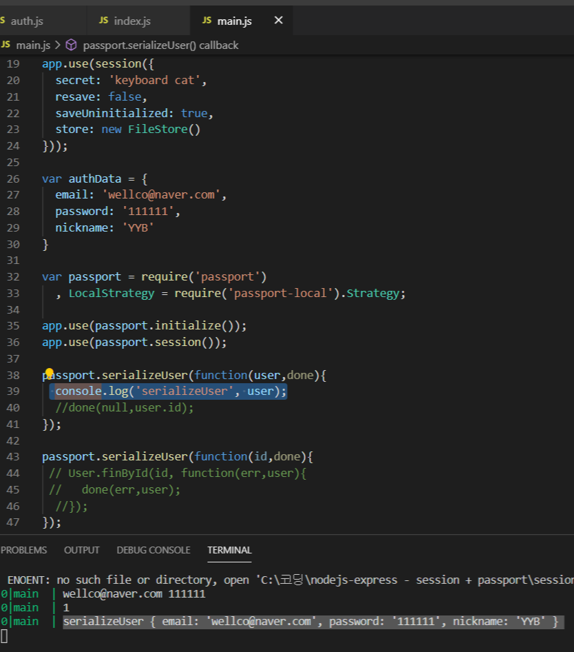 이후 로그인을 해보면 serializedUser함수가 호출되며 즉 passport는 로그인에 성고했다면