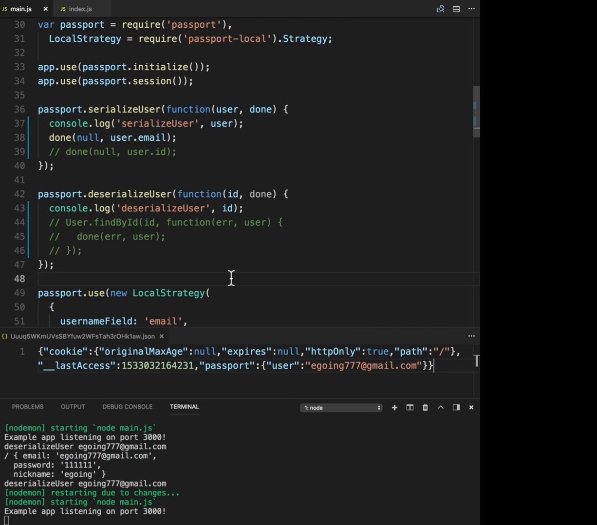 6.로그인에 성공했을때 serializeUser라는 메소드의 인자로 전달된 콜백함수가 호출되도록