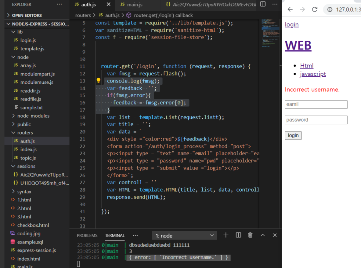 *session 디렉토리의 flash 객체 메세지 값이 위 콘솔창처럼 error : ['Incorrect username']이라고 생성되야 하는게