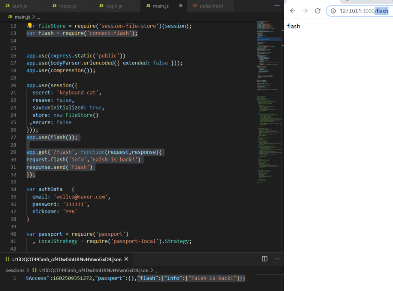4. 이 미들웨어는 session을 내부적으로 사용하기 때문에 session 미들웨어 다음 으로 app.use(flash()); 코드 작성 이러면 웹페이지로 들어올때마다 플래쉬 작동
