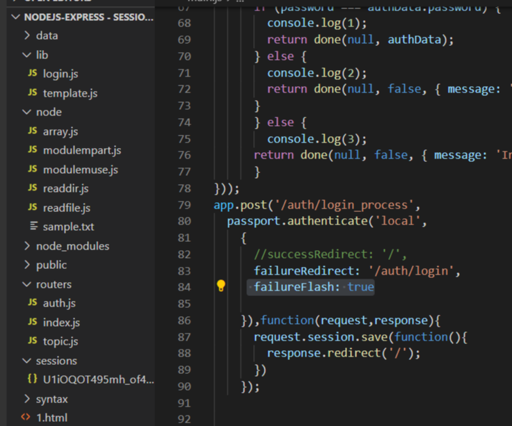 1. failureFlash:true 를 주어 메세지를 활용토록 설정하고 이 기능은 request.flash()함수를 구현해야하는데