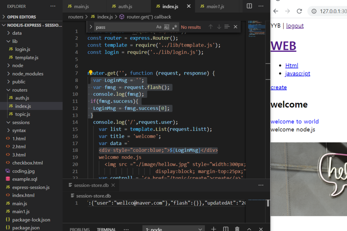 (1) req.flash('key', 'value')를 통해서 session에 데이터를 삽입할 수 있습니다.