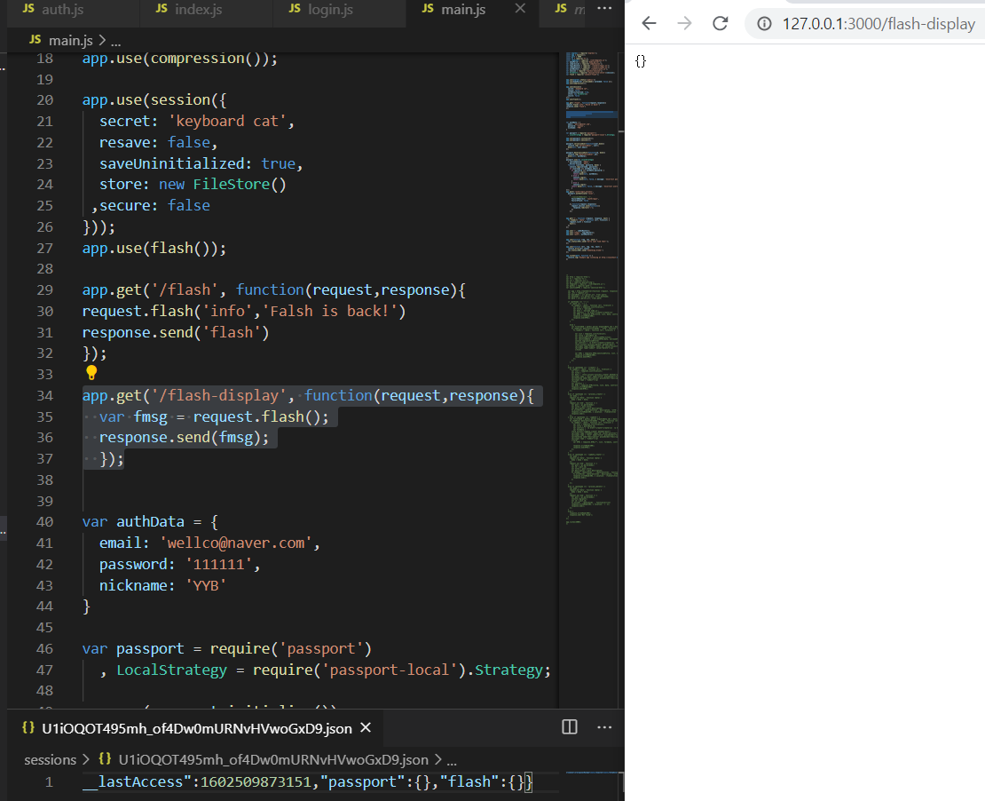 세션스토어의 flash객체에 error메세지 저장되지는 않는다.. 아마도 저장되자마자 request.flash()에 의해 {}로 바뀌고