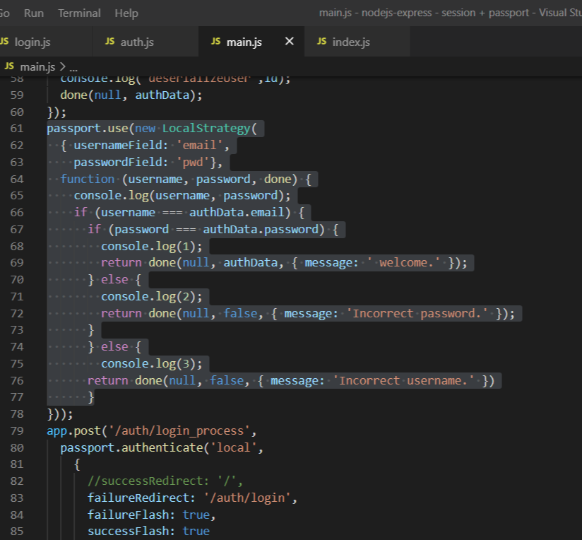 (2) passport에서 내부적으로 flash 메시지를 사용할 수 있도록 failureFlash : true로 설정합니다. successFlash 라는 옵션도 있습니다.