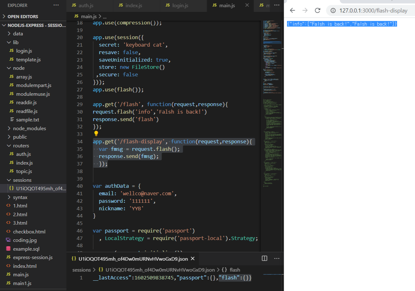 /falsh로 들어 왔을때 request.flash('info','Flash is back!')로 인해서 session 스토어에 flash속성의 값(메세지)이 생성되게 된다