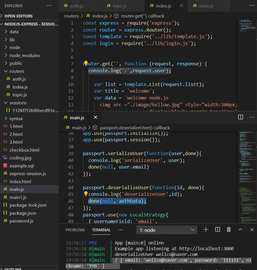 로그인 이 후 다시 페이지를 리로드 해보면 main.js의 deserializeUser가 호출되면서 45번쨰 줄의 console.log