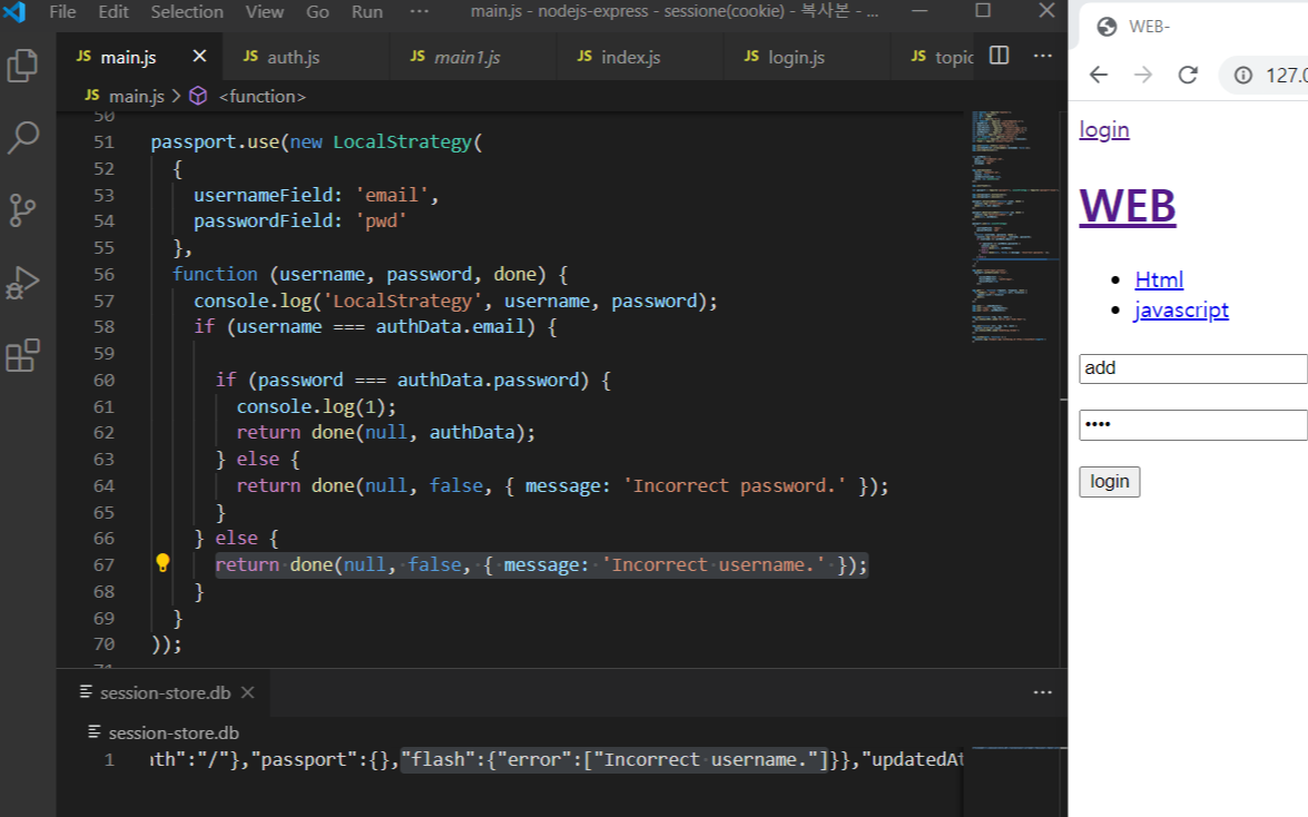 실행되고 done콜백함수에 의해서 세션스토어에 "error" : ["Incorrect username"] 의 형식으로 저장된다.