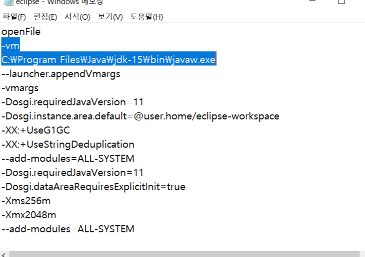 3. 해당 위치에 아래 두줄을 입력 ( JVM의 경로를 직접 적용)