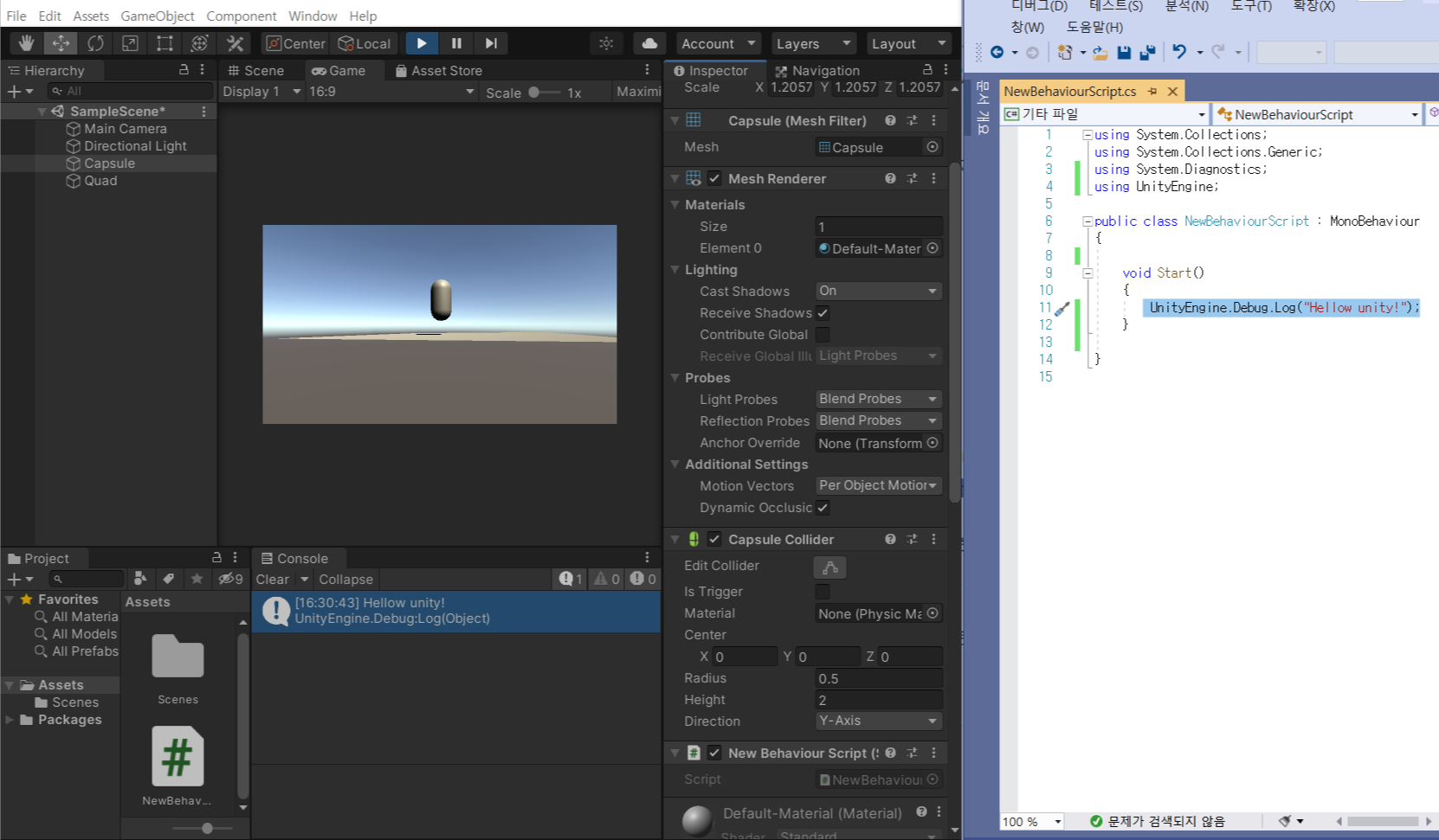 4. project에서 우클릭 후 create - C# sctipt 클릭하면 #파일 생성 -> 더블클릭 후 우측과 같이 c# 스크립트 작성(Hellow Unity!)