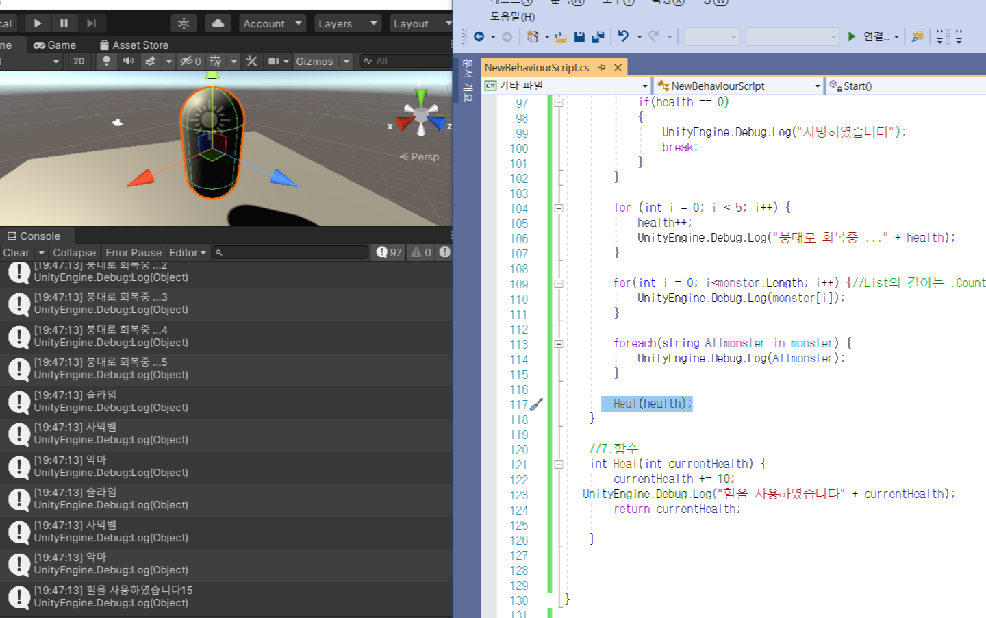 int Heal(int currentHealth){}에서 int는 리턴값의 데이터타입 int는 매개변수의 데이터 타입